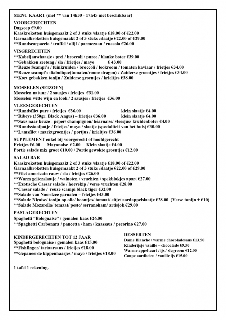 ’s Middags kan u met uw gezelschap genieten van een heerlijke lunch (soep of voorgerecht, hoofdgerecht vis of vleesgerecht) of à la carte alsook seizoensgebonden suggesties.